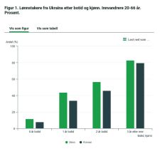 Det var litt over 47 000 innvandrere fra Ukraina i alderen 20–66 år bosatt i Norge i juni 2024. Totalt sett er det liten forskjell mellom menn og kvinner i andelen lønnstakere blant innvandrere fra Ukraina. Men blant de som har kommet etter krigen er forskjellene merkbare. Blant de som har bodd i Norge i omtrent ett år, er det henholdsvis 44 og 34 prosent menn og kvinner som er i jobb. Etter omtrent to år er de tilsvarende tallene 57 og 46 prosent. Sammenlignet med andre grupper av flyktninger, blir de fra Ukraina raskere sysselsatt.